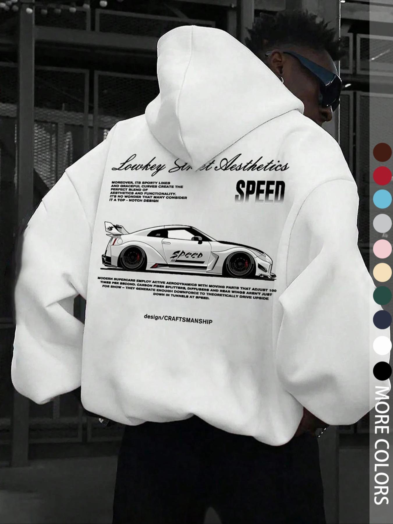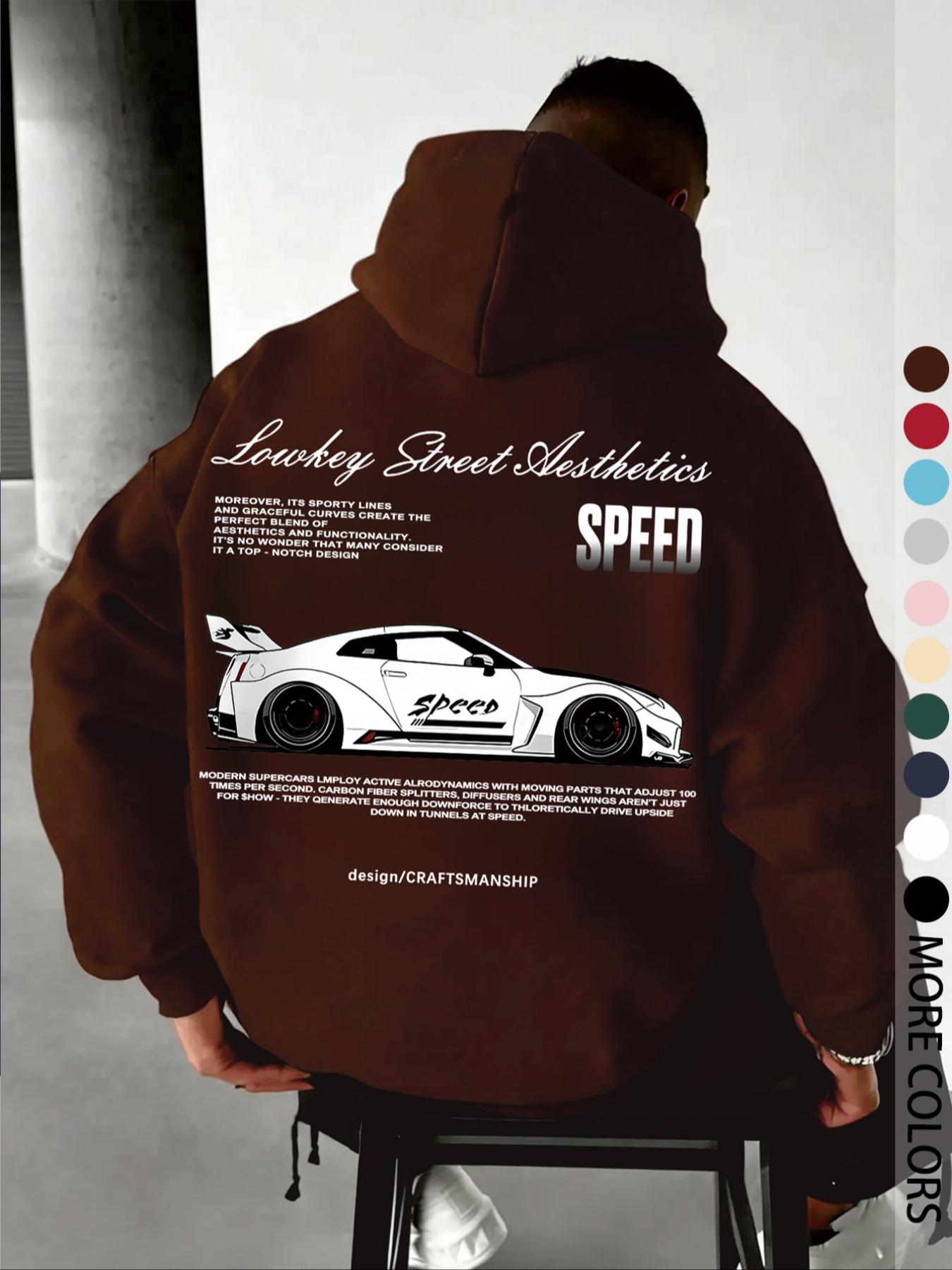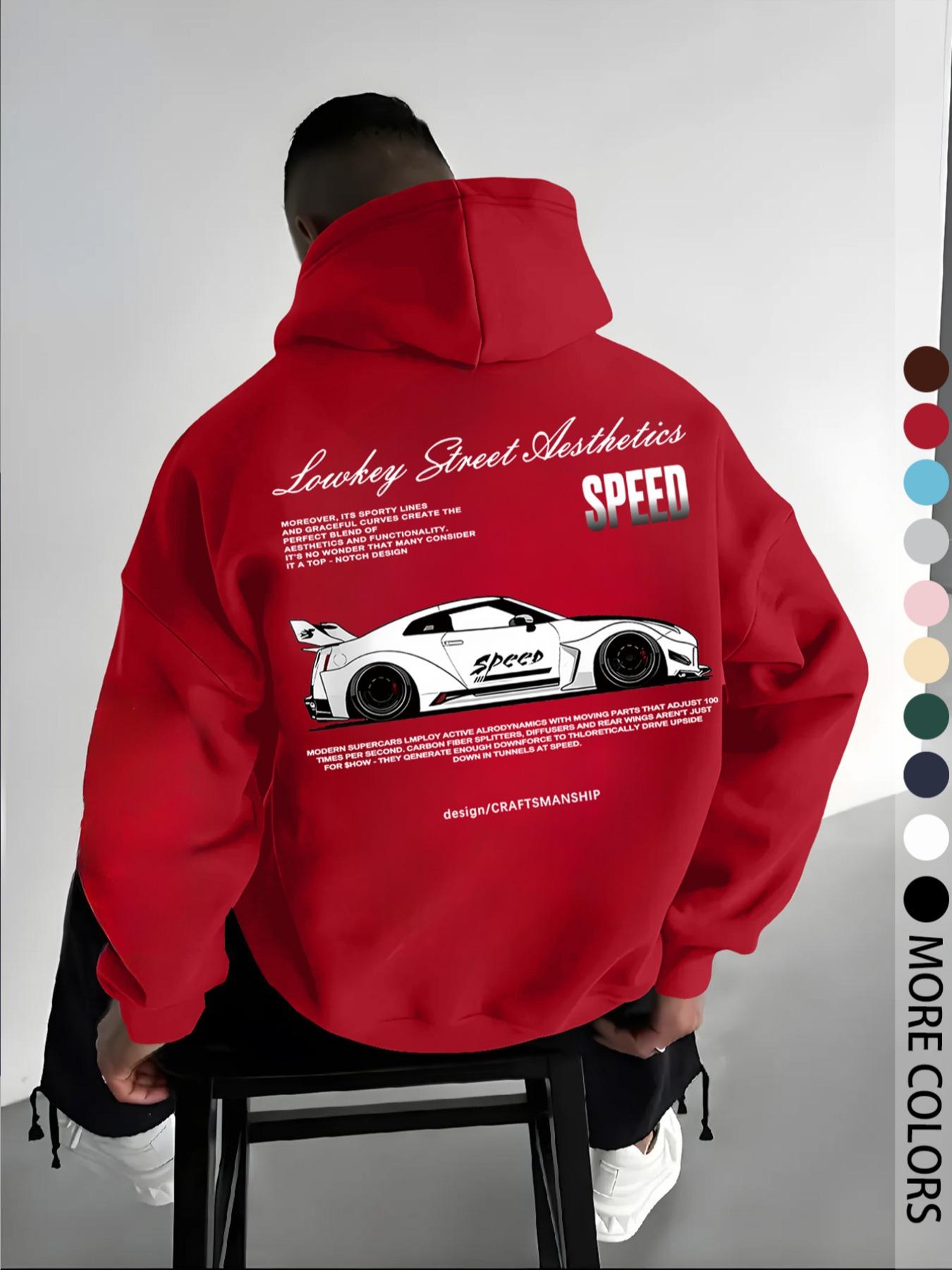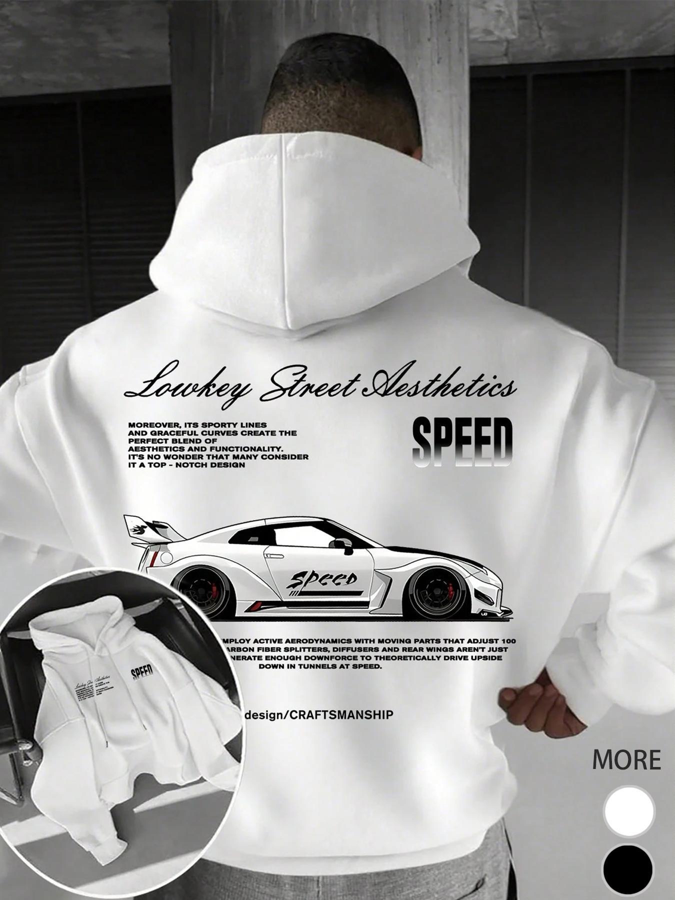 Unisex Cyberpunk Street Style Hoodie, "Low-Key Street Aesthetics" Letter Print and "Speed Car Pattern" Print, Loose Fit, Fall Winter Casual Wear, Unisex Y2K Fashion Gift