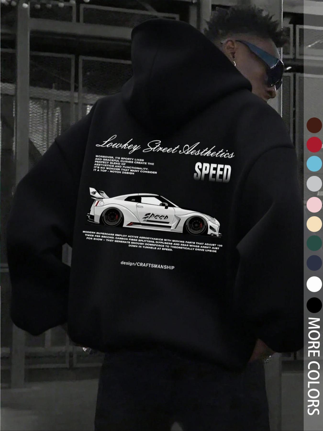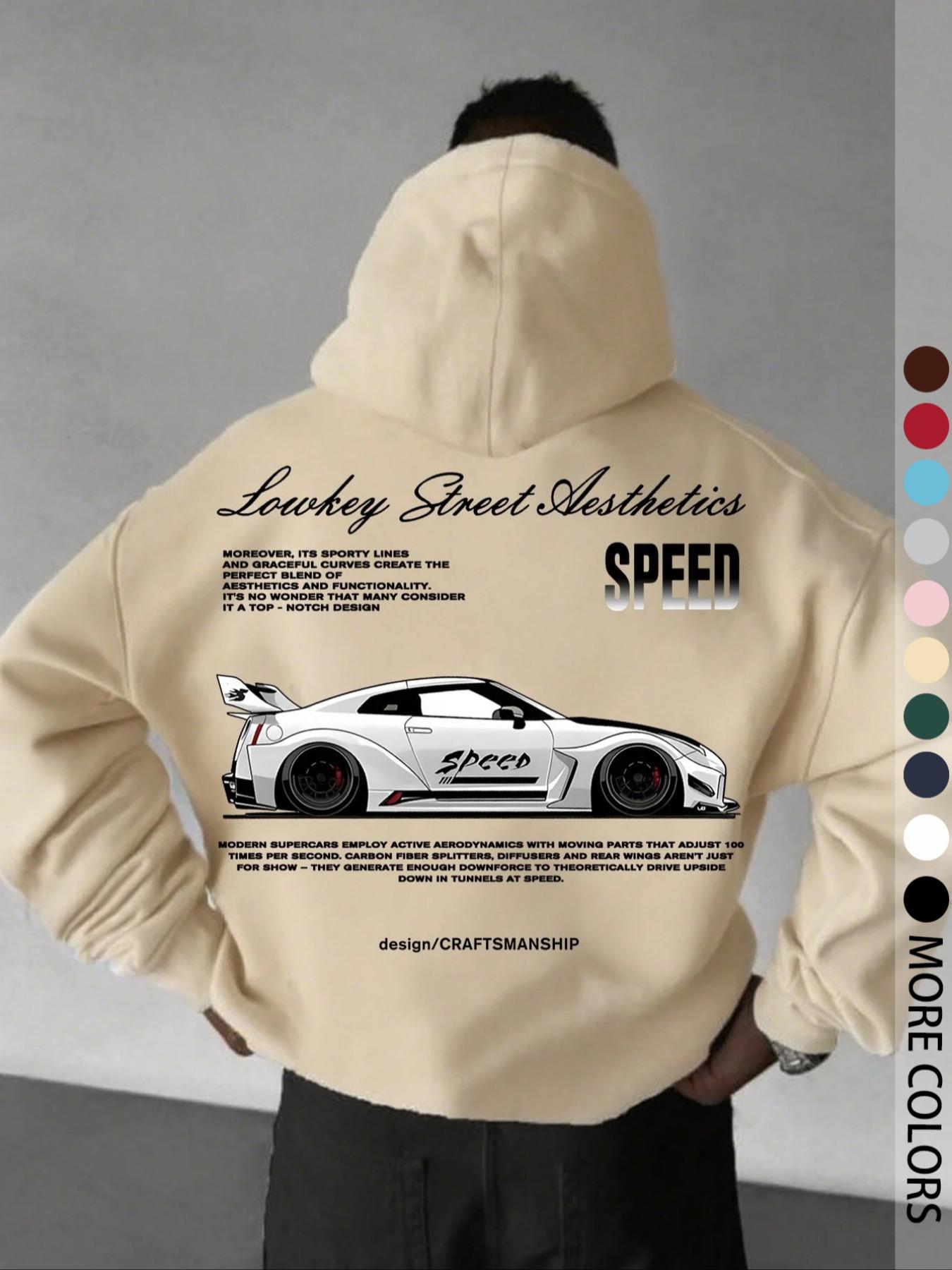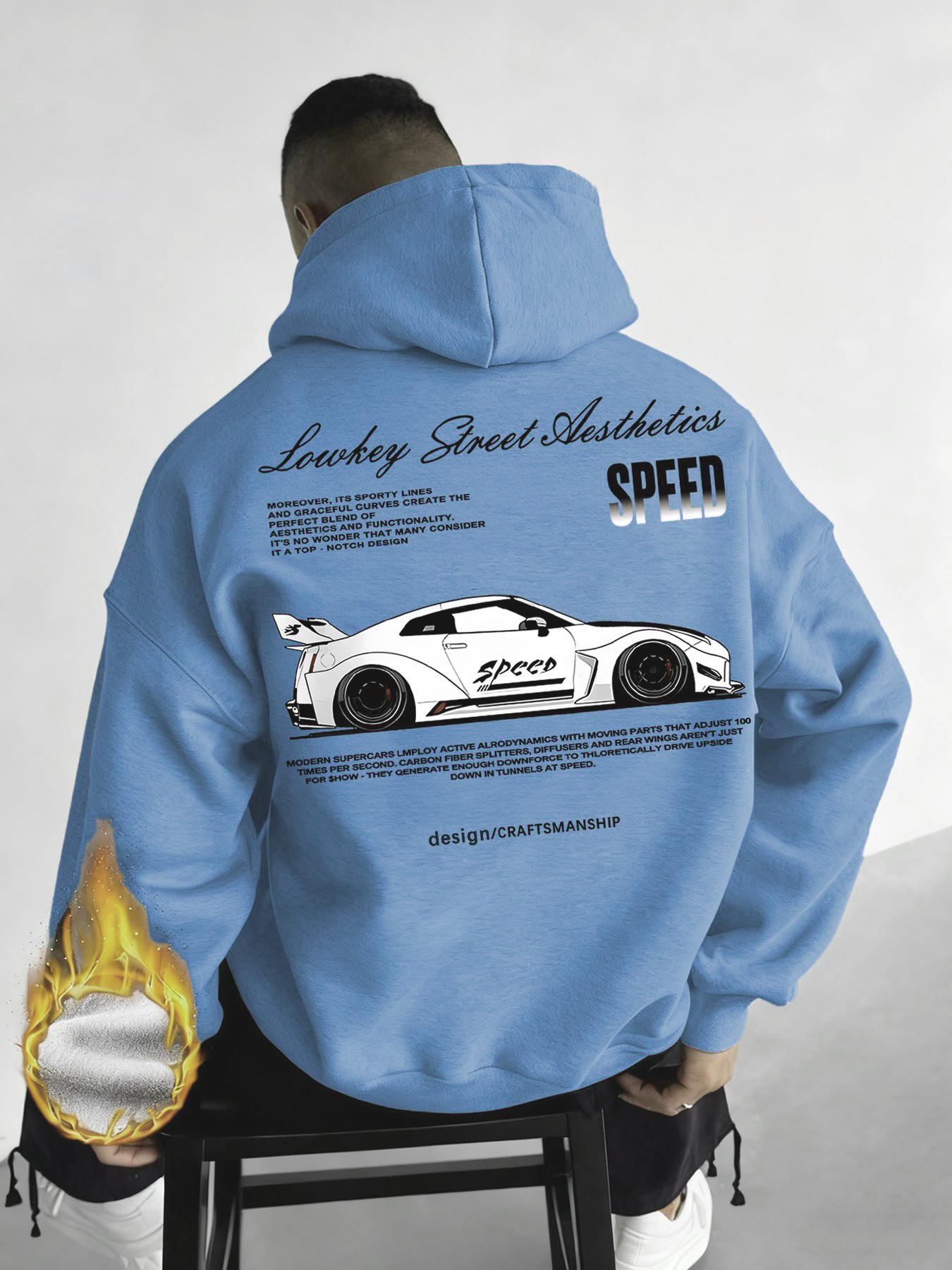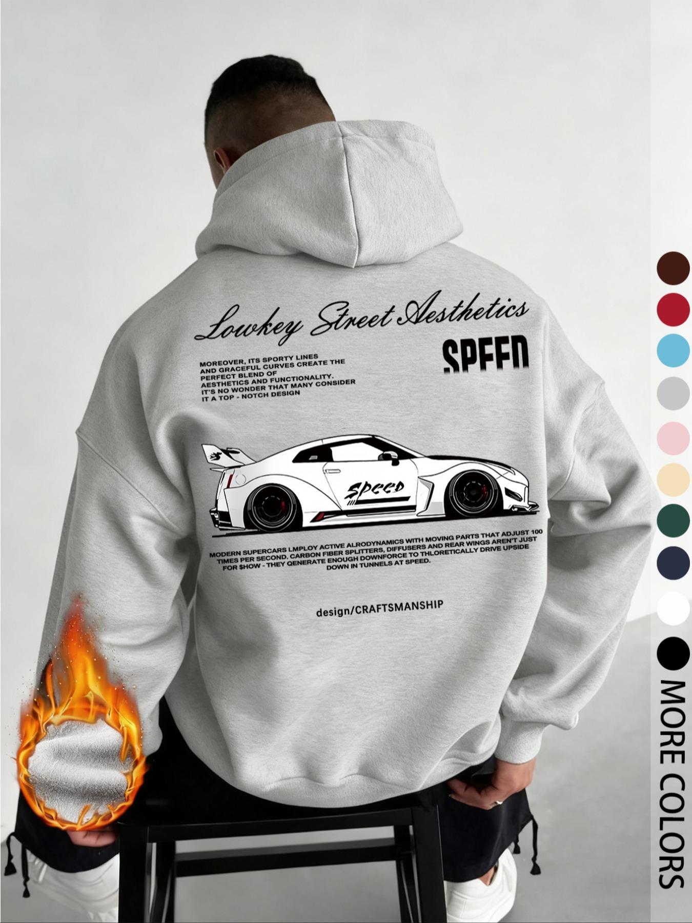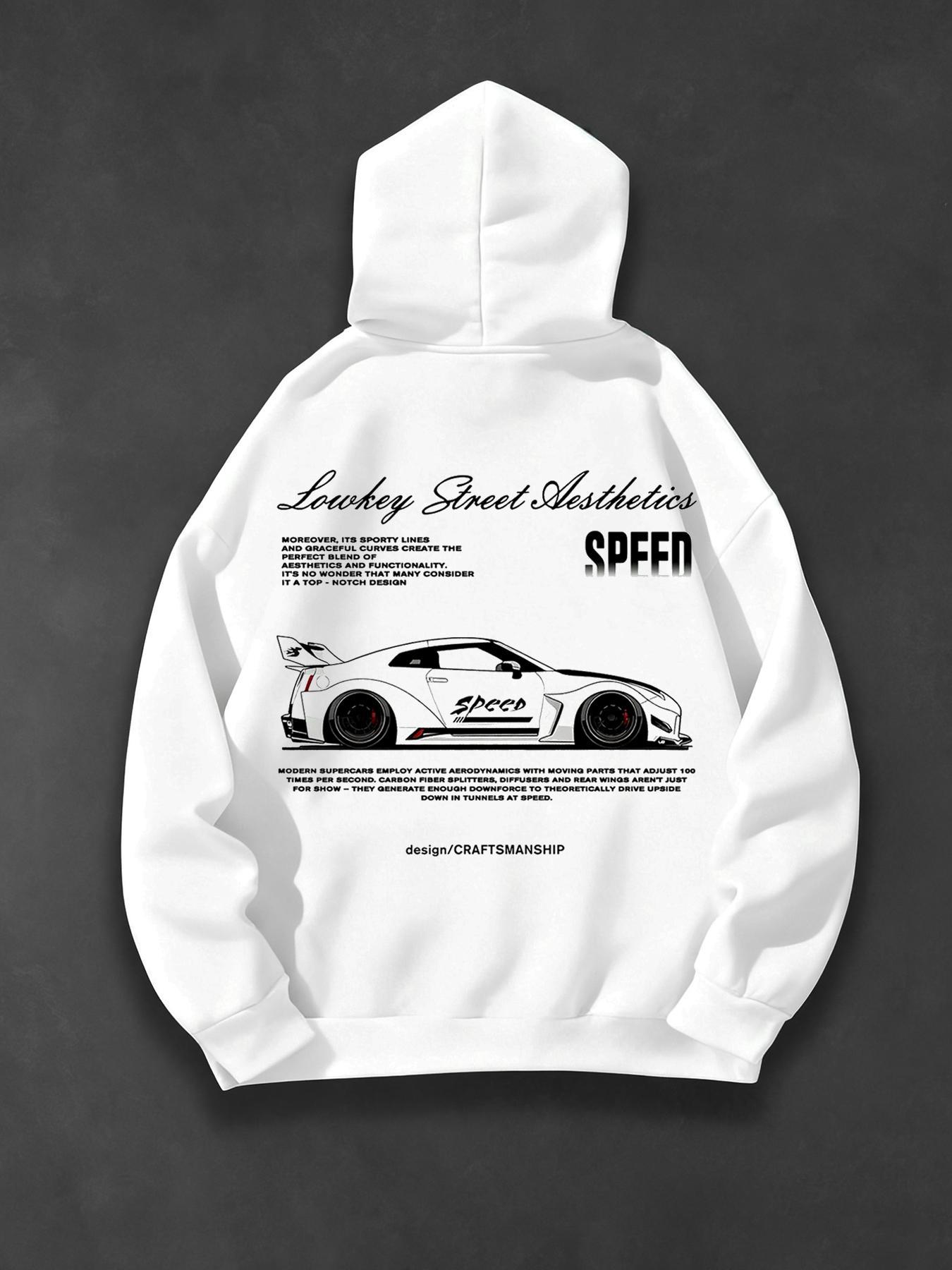Unisex Cyberpunk Street Style Hoodie, "Low-Key Street Aesthetics" Letter Print and "Speed Car Pattern" Print, Loose Fit, Fall Winter Casual Wear, Unisex Y2K Fashion Gift