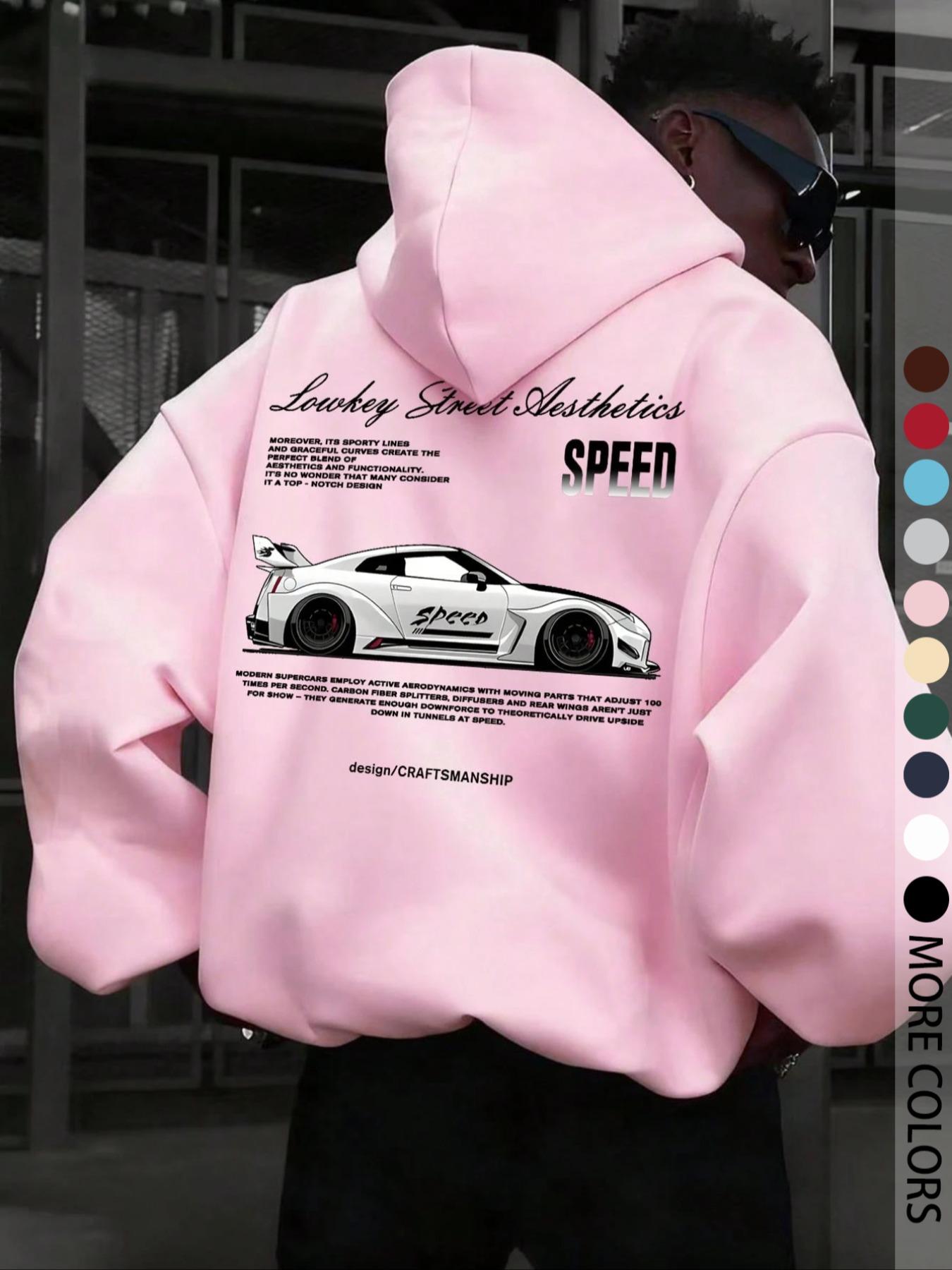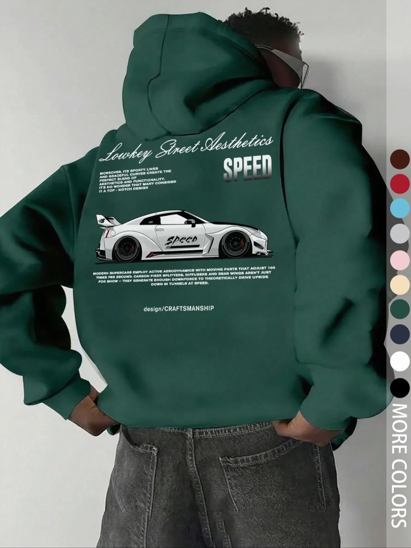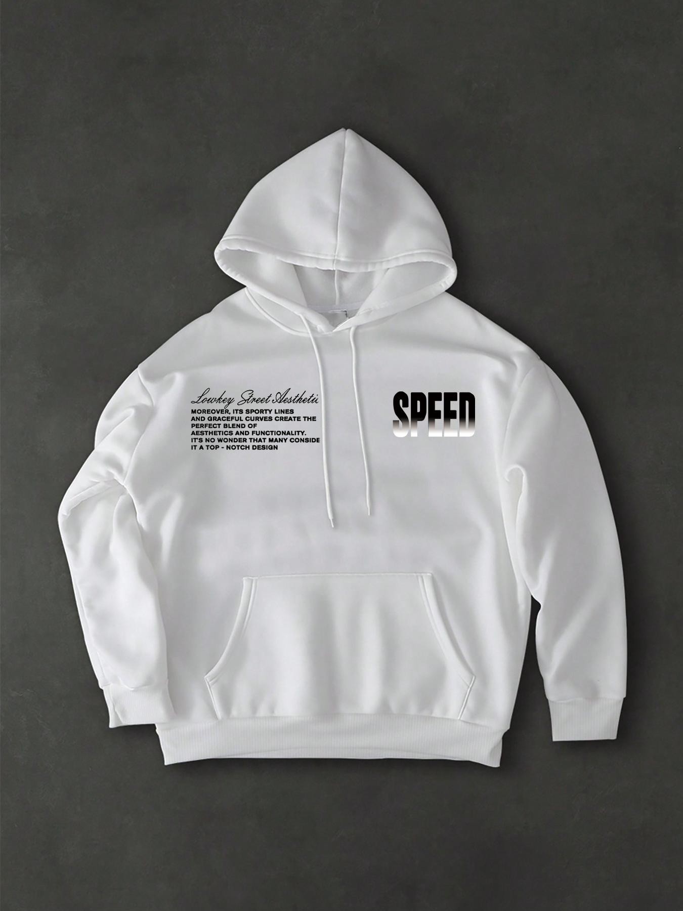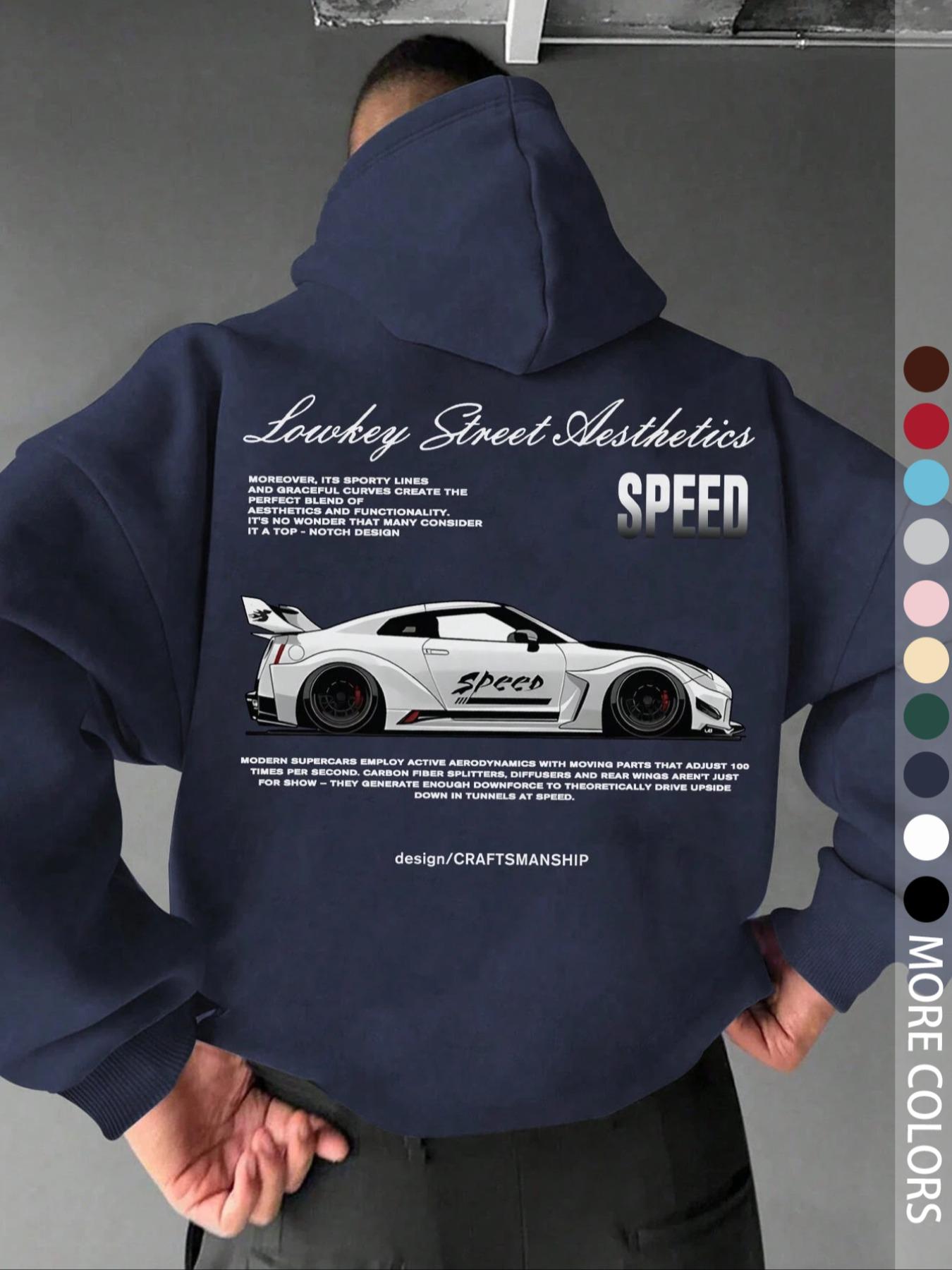 Unisex Cyberpunk Street Style Hoodie, "Low-Key Street Aesthetics" Letter Print and "Speed Car Pattern" Print, Loose Fit, Fall Winter Casual Wear, Unisex Y2K Fashion Gift